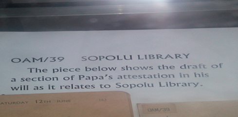 The Sopolu Library was the private library of the late Chief Obafemi Awolowo, SAN. GCFR. It is situated within the residential premises of Chief Awolowo, in Ikenne which is about 27 Kilometers from Ago-Iwoye. Sopolu Library was bequeathed to the University by Late Chief elder statesman Obafemi Awolowo. The Library was formally handed over to the University in 1989. find below a copy of the will bequeathing the Sopolu Library to the Olabisi Onabanjo University as found in Obafemi Owolowo's Museum:
